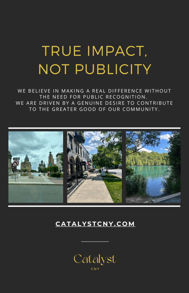 At Catalyst CNY, we unite dedicated community leaders to create meaningful change in Central New York. Our renowned network drives impactful initiatives that foster community development, economic growth, and social equity. We provide our members with exclusive opportunities and confidential collaboration, enabling them to contribute effectively and make a profound difference. Here, it’s not about personal recognition but about working behind the scenes to drive real, positive change for our community.